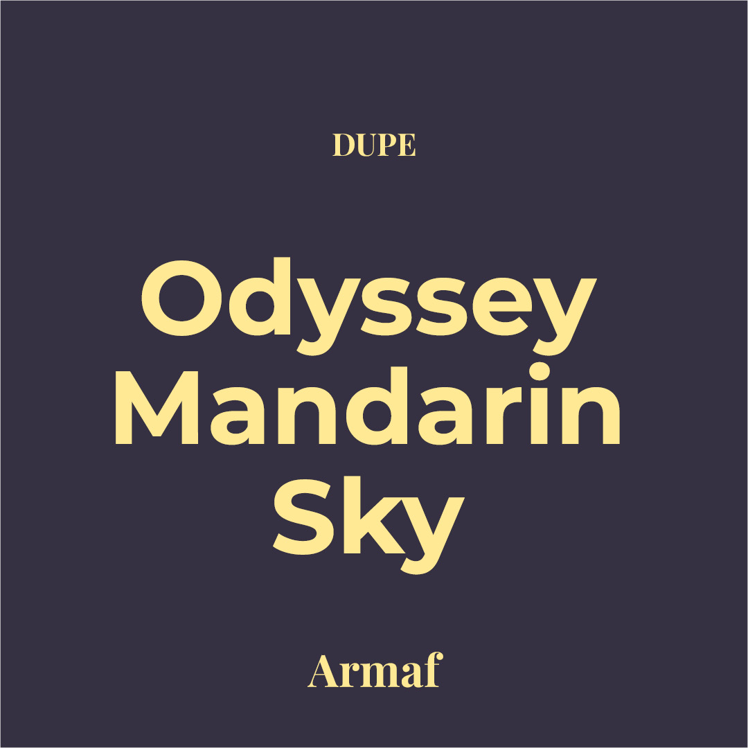 Dupe Odyssey Mandarin Sky de Armaf Point G Perfumeria. Cítrica y moderna, con notas como mandarina, naranja, azafrán y salvia; corazón goloso de caramelo, haba tonka y cempasúchil, sobre una base limpia–amaderada de ambroxan, cedro y vetiver. Aporta contraste brillante–ambarado con proyección equilibrada y buena fijación sin saturar. Ideal para tardes y noches casuales, oficina y salidas en climas cálidos a templados.