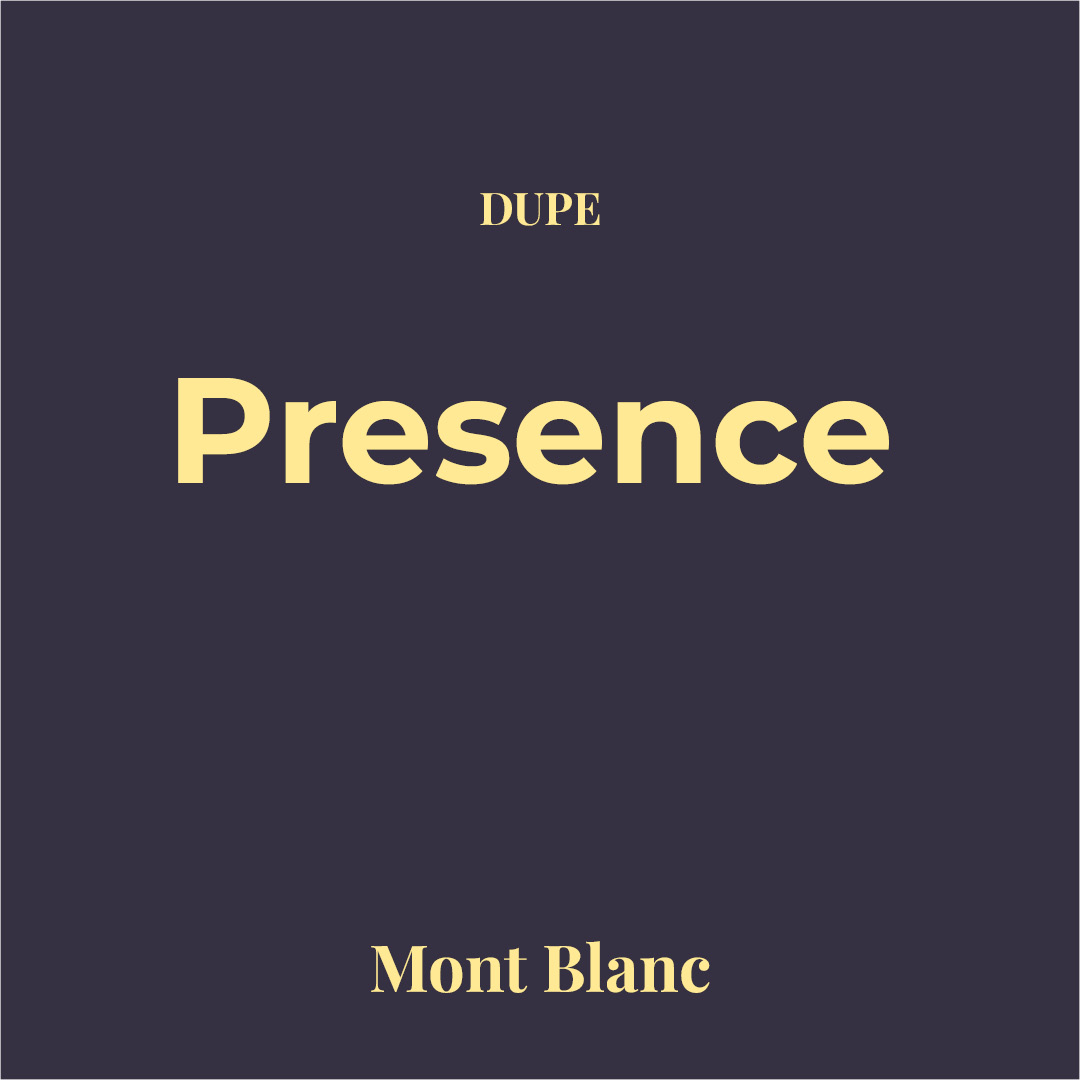 Dupe Presence de Montblanc Point G Perfumeria. Especiada-oriental con carácter elegante, con notas como canela, cardamomo, jengibre y bergamota; corazón de manzana, salvia y heliotropo, sobre un fondo cálido de haba tonka, sándalo, almizcle blanco, ámbar y madera de teca. Aporta una estela envolvente y profesional con proyección equilibrada y buena fijación sin saturar. Ideal para oficina, reuniones y noches casuales en climas templados a frescos.
